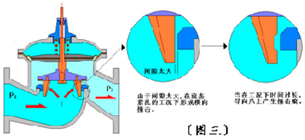 4.2.2導(dǎo)向爪與閥座的間隙太大(總間隙1mm)。因此,當(dāng)紊流產(chǎn)生時形成導(dǎo)向爪與閥座之間的相互撞擊。由于導(dǎo)向爪為銅材質(zhì)、閥座為不銹鋼材質(zhì),工作時間一長,在導(dǎo)向爪上形成撞擊痕跡。如圖三所示