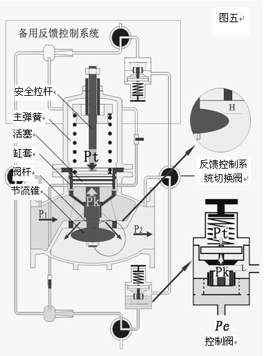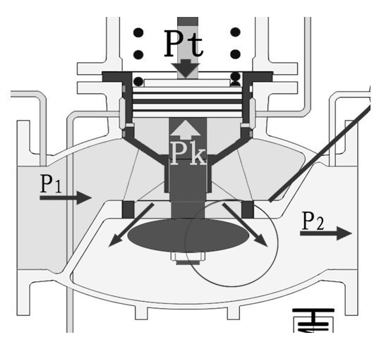 當(dāng)P1上升時,減壓閥的P2+ΔP2首先表現(xiàn)為上升,其值通過反饋系統(tǒng)出口管傳到控制閥,使Pt′+ΔPt′,ΔPt′與Pk′的力達(dá)到新的平衡,控制閥h減小;相應(yīng)ΔPk′壓力增大,經(jīng)壓力導(dǎo)管,使主閥的Pk+ΔPk,Pt=Pk+ΔPk壓力達(dá)到新的平衡,主閥h減小、ΔP2值恢復(fù)為原P2值。當(dāng)進(jìn)口壓力P1下降時,主閥與控制閥的工況則與上述的工況相反。