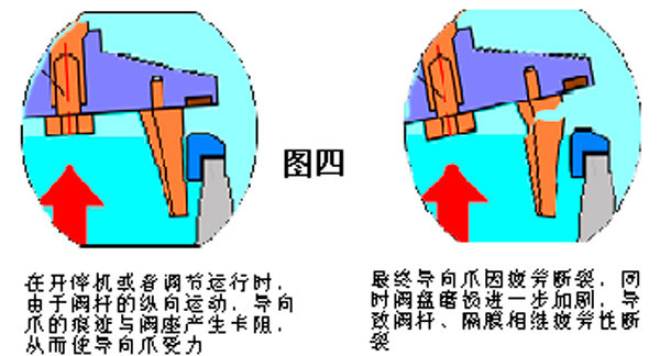 4.2.3終,因機(jī)組開停機(jī)或流量變化時,導(dǎo)向爪上形成痕跡卡在閥座上,在縱向受力的工況下,導(dǎo)致導(dǎo)向爪、閥桿的彎曲或斷裂。如圖四所示。#5、#4機(jī)減壓閥解體檢查看,閥座不銹鋼圈螺栓存在松動、脫落隱患,隔膜碟鎖固螺栓也無安全鎖定措施等,致使減壓閥在使用過程中存在一定的安全風(fēng)險(xiǎn)。